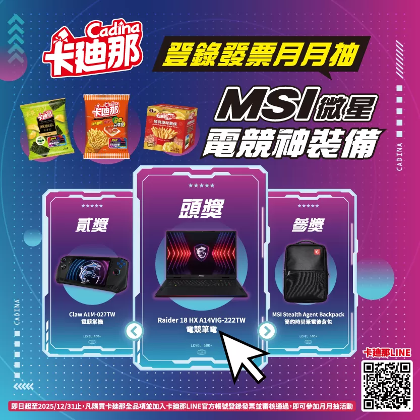活動期間購買卡廸那全系列任一品項(卡廸那洋芋片、卡廸那地瓜片、卡廸那芋頭片、卡廸那四重脆、卡廸那德州薯條、卡廸那小德薯、卡廸那寶咔咔、卡廸那胖鯊脆脆、卡廸那豌豆脆片、卡廸那玉米糙米脆片、卡廸那95℃系列等,下稱活動商品),不限發票金額,即可至「卡廸那LINE官方帳號」(下稱LINE官方帳號)登錄購買發票資訊,完成參加抽獎程序。