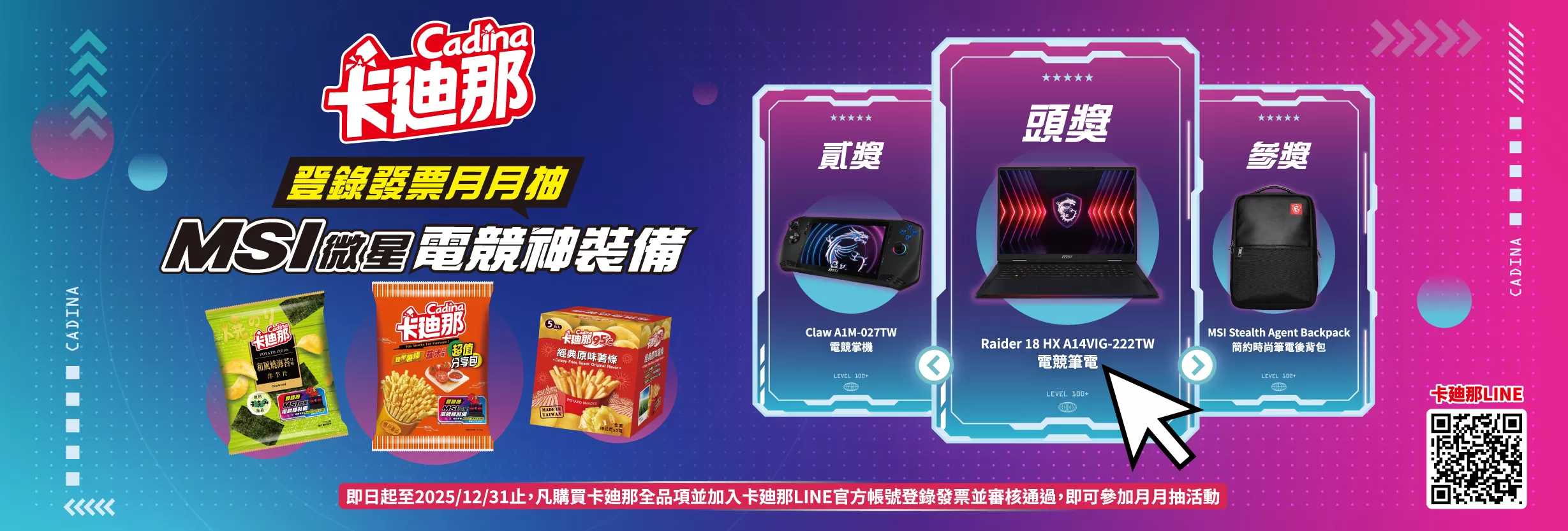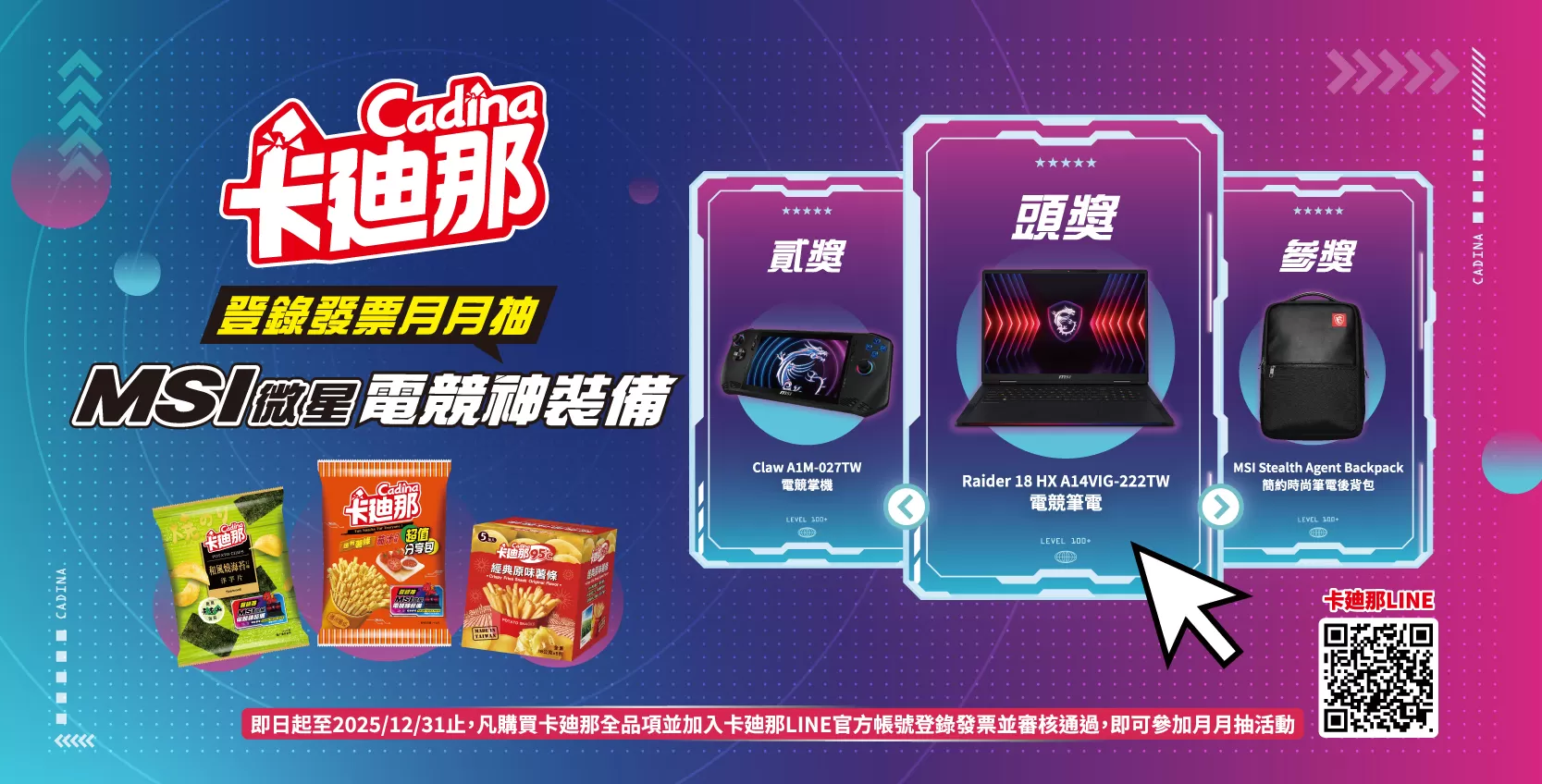 活動期間內,凡購買卡廸那全系列任乙件產品,加入卡廸那LINE官方帳號並登錄購買發票號碼完成,即可參加【卡廸那 月月抽技嘉AORUS電競筆電】活動,就有機會獲得AORUS 16X AI電競筆電(價值NT$68,900元)!活動期間購買卡廸那系列產品之消費金額,經審核符合將可獲得活動點數,以10元為1點換算,達指定點數即可集點兌換卡廸那及AORUS週邊商品!數量有限,換完為止。
